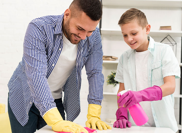 Declutter first — Ever tried to clean a cluttered space? It’s very difficult or even impossible to do. First focus on de-cluttering the most often used areas, like desks and desktops, common spaces like the kitchen, commissary areas, and break rooms. Then move onto the lesser used spaces, including storage areas.